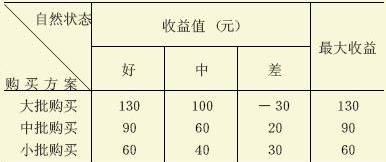 仍然以上述案例為例,各種方案的最小收益值分別為-30、20和30,由此可見,最小收益值中的最大值為30,也即在最小收益值為30元時,所對應的購買方案風險最小,故宜選取小批購買的方案。
