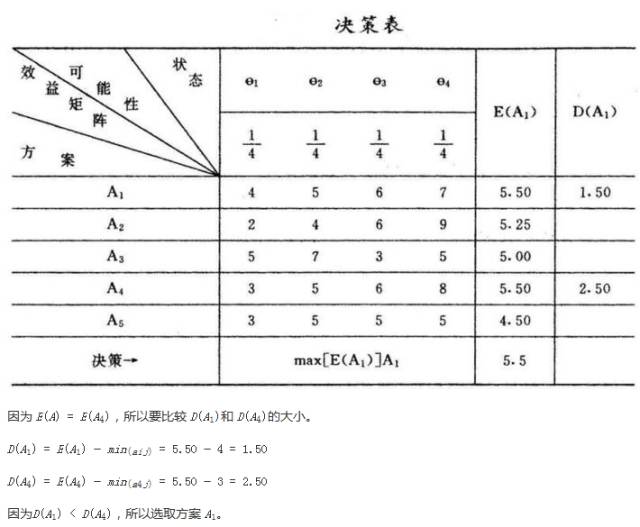 假設有五個行動方案 A1,A2,A5,四個自然狀態(它們出現的概率不知道),其相應的效益值列於下表: