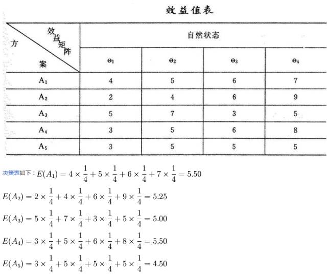當決策人在決策過程中,不能肯定哪種狀態容易出現,哪種狀態不容易出現時,假定每一種方案遇到各種自然狀態的可能性是相等的,然後求出各種方案的損益期望值,以此作為依據,進行決策。如果有 n個自然狀態,那麼每個自然狀態出現的概率即為1\n,然後按收益最大的或損失最小的期望值(或矩陣法)進行決策。