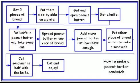 比如說,主題是“怎樣做一個花生醬的三明治”,流程則是“拿兩塊麵包”、“將麵包放在餐盤上”、“拿花生醬”等等,一直到最後“享受你的美味三明治”。