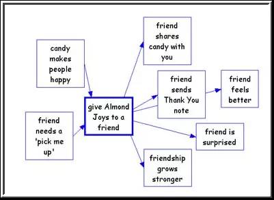 比如這圖裡,主題是“將杏仁條給朋友”,左邊的原因方框是,“糖果讓人開心”、“朋友需要我的説明”,右邊的結果方框是,“友誼更長久”、“朋友很吃驚”、“朋友表示感謝”等。