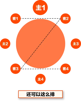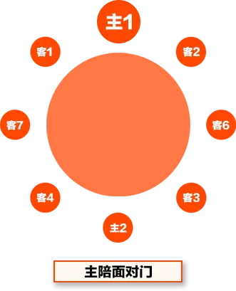 宴请客人,一般主陪在面对房门的位置,副主陪在主陪的对面,1号客人在主陪的右手,2号客人在主陪的左手,3号客人在副主陪的右手,4号客人在副主陪的左手,其他可以随意。可参见下图的座次排列:
