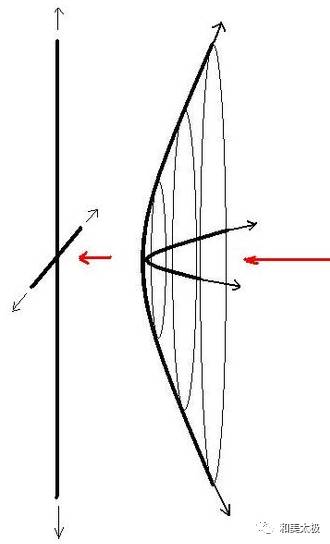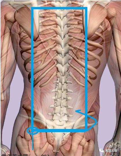 太极拳是用腰胯开合来发劲,不是腰马合一的。咏春或空手道等才是讲求腰马合一,那是腿与腰组合成一体做上肢发力的底盘,底盘越结实,力量越大。太极拳要松腰胯,当大腿转动而膝不动的情况下,丹田命门作不动中心点,胯与脚跟的连线会钻动把胯拉开。力量会指向丹田命门形成扭力如图1,当肩保持沉着不动时,扭力会使肩与命门的连线转动,命门与肘的连线被撑开,手被抬起来,用的是裆劲。以腰胯开合而论,两肩与两胯应有两条对角线,左肩连线右胯,右肩连线左胯,中心交点在中轴上正是命门。