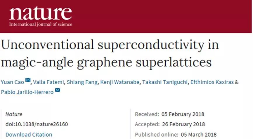 3月5日,物理学家在两篇发表在《自然》期刊的论文中指出,当两层石墨烯以一个“魔角”扭曲在一起时,就能在零电阻下导电。更确切地说,物理学家将两层只有原子厚的石墨烯以特别的角度堆叠在一起,当碳原子间的排列呈1.1度(这个角度就是所谓的“魔角”)的角度偏移时,就会使材料变为超导体。尽管该系统仍然需要被冷却至绝对零度以上1.7度,但结果表明了它或许可以像已知的高温超导体那样导电。一旦该结果被确认,此次的发现对于理解高温超导电性至关重要。