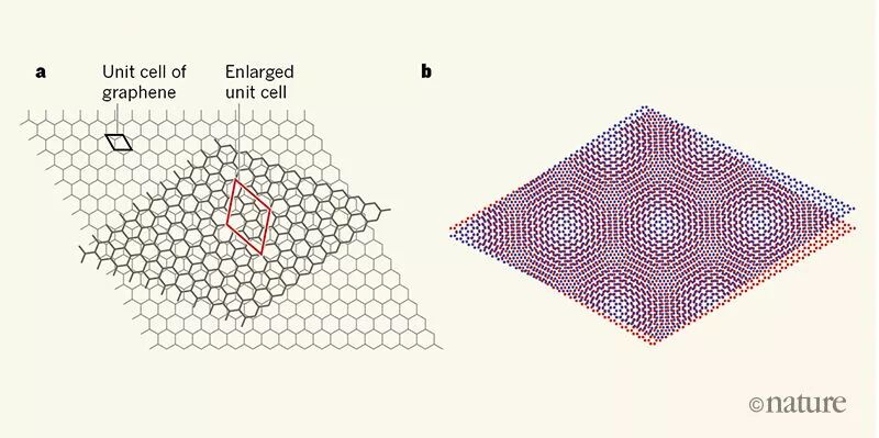 ○ 在扭转双层石墨烯中的旋转效应:a. 当双层石墨烯被扭曲时,上层薄片被旋转使得无法与下层薄片对齐,从而让元胞(unit cell)得到扩展(红色)。b. 对于小角度的旋转,就会出现所谓的“摩尔纹”(moiré pattern),其中局部堆叠的排列呈周期性变化。| 图片来源:Nature